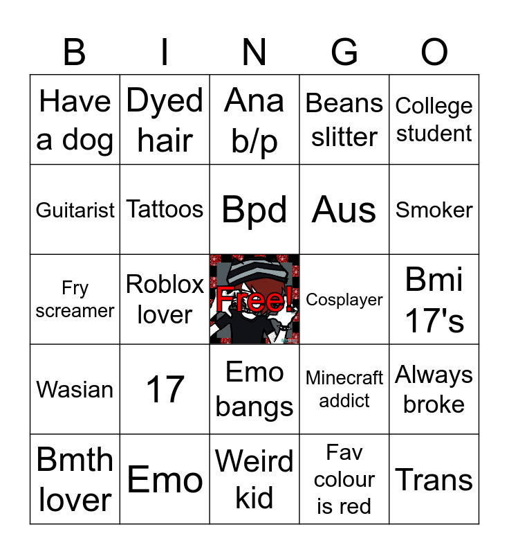 This bingo card has a free space and 24 words: 17, Emo, Bpd, Bmth lover, College student, Have a dog, Guitarist, Dyed hair, Cosplayer, Emo bangs, Aus, Fry screamer, Minecraft addict, Always broke, Tattoos, Fav colour is red, Bmi 17's, Ana b/p, Smoker, Roblox lover, Trans, Wasian, Beans slitter and Weird kid.