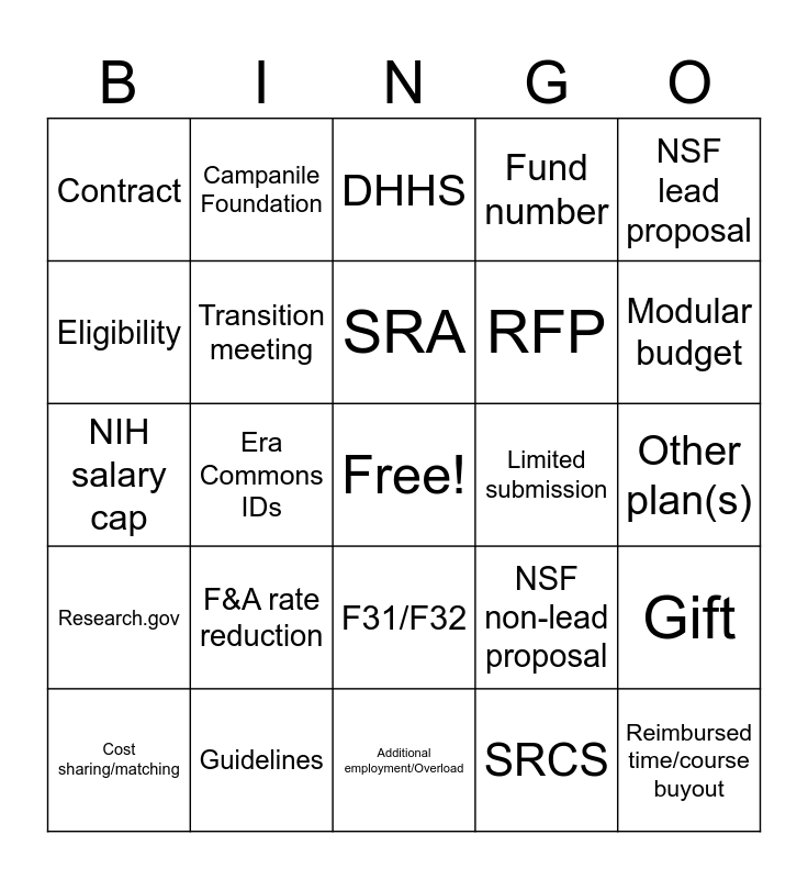 This bingo card has a free space and 29 words: Cost sharing/matching, InfoEd, Era Commons IDs, Grant, Contract, DHHS, Transition meeting, F&A rate reduction, Limited submission, Guidelines, Other plan(s), Reimbursed time/course buyout, Additional employment/Overload, SRCS, Modular budget, NSF, F31/F32, Research.gov, NSF lead proposal, NIH salary cap, NSF non-lead proposal, NIH, RFP, Eligibility, Fund number, Campanile Foundation, Gift, SRA and Third party cost share.