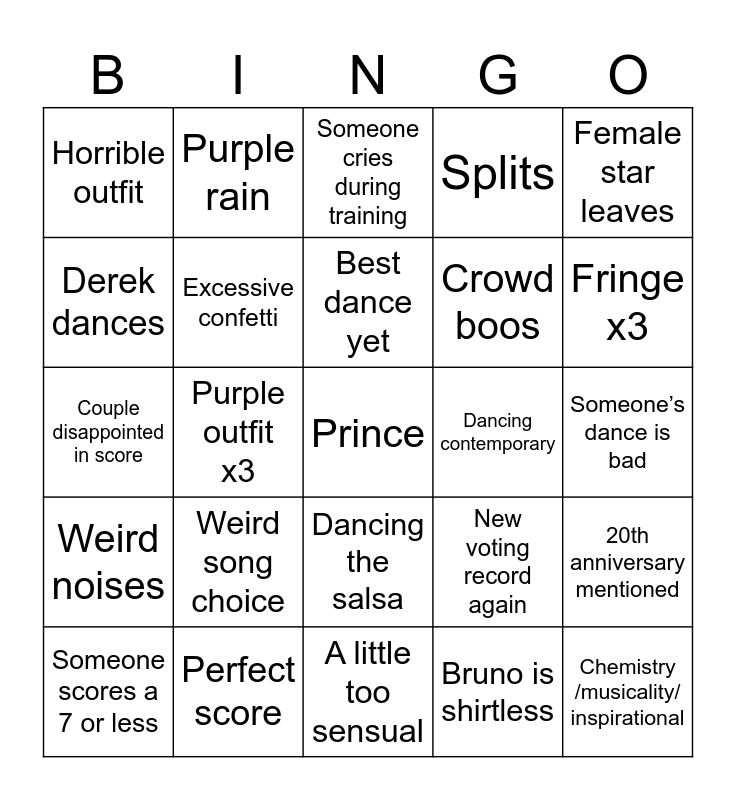 This bingo card has a free space and 24 words: Weird song choice, Perfect score, Best dance yet, Someone scores a 7 or less, Female star leaves, Horrible outfit, Derek dances, Purple rain, Dancing contemporary, Dancing the salsa, Crowd boos, Couple disappointed in score, New voting record again, 20th anniversary mentioned, Excessive confetti, Bruno is shirtless, Someone’s dance is bad, Someone cries during training, Fringe x3, Purple outfit x3, Chemistry /musicality/ inspirational, Weird noises, Splits and A little too sensual.