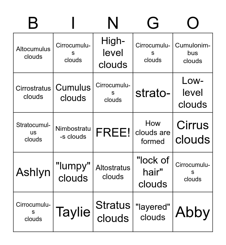 This bingo card has a free space and 29 words: Cirrocumulu-s clouds, Fog, Nimbostratu -s clouds, Clouds, Altocumulus clouds, High-level clouds, Cumulus clouds, "lumpy" clouds, How clouds are formed, Taylie, Cirrus clouds, Abby, Stratus clouds, "layered" clouds, Low-level clouds, alto-, Altostratus clouds, Ashlyn, Cumulonim-bus clouds, Stratocumul-us clouds, "lock of hair" clouds, Mid-level clouds, strato-, Cirrostratus clouds, Cirrocumulu-s clouds, Cirrocumulu-s clouds, Cirrocumulu-s clouds, Cirrocumulu-s clouds and Cirrocumulu-s clouds.