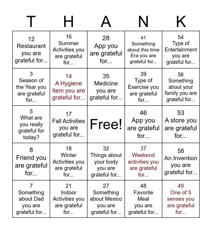 This bingo card has a free space and 58 words: 1 Dessert you are grateful for..., 13 Item of Clothing you are grateful for..., 25 Something about your home you are grateful for..., 37 Weekend activities you are grateful for..., 49 One of 5 senses you are grateful for..., 2 A teacher you are grateful for, 14 A Hygiene Item you are grateful for..., 26 Beverage you are grateful for..., 39 Type of Exercise you are grateful for..., 50 A pet you are grateful for..., 3 Season of the Year you are grateful for..., 15 Christmas activities you are grateful for..., 40 Inspiring person you are grateful for..., 51 One of 5 senses you are grateful for.., 4 Cleaning Appliance you are grateful for..., 16 Summer Activities you are grateful for..., 27 Something about Mexico you are grateful for..., 41 Something about this time Era you are grateful for..., 52 Time of Day you are grateful for..., 5 What are you really grateful for today?, 17 Fall Activities you are grateful for..., 28 App you are grateful for..., 42 Something about work or school you are grateful for..., 53 A store you are grateful for..., 6 Something about Mom you are grateful for..., 18 Winter Activities you are grateful for..., 29 Holiday you are grateful for..., 43 Piece of Furniture you are grateful for..., 54 Type of Entertainment you are grateful for..., 7 Something about Dad you are grateful for..., 19 Types of Weather you are grateful for..., 30 Family Activities you are grateful for..., 45 Teacher you are grateful for..., 55 Cooking Appliance you are grateful for..., 8 Friend you are grateful for..., 20 Outdoor Activities you are grateful for..., 31 Hobbies you are grateful for..., 46 App you are grateful for..., 56 Something about your family you are grateful for..., 9 Class in school you are grateful for..., 21 Indoor Activities you are grateful for..., 32 Things about your body you are grateful for..., 47 Dairy Product you are grateful for..., 57 Something about your health you are grateful for..., 10 Book you are grateful for..., 22 Types of Music you are grateful for..., 33 One of 5 senses you are grateful for..., 48 Favorite Meal you are grateful for..., 58 An Invention you are grateful for..., 11 Part of Nature you are grateful for..., 23 Past Vacations you are grateful for..., 34 Something about your neighborhood you are grateful for..., 36 Government Service you are grateful for..., 59 A Role Model you are grateful for.., 12 Restaurant you are grateful for..., 24 Animal you are grateful for..., 35 Medicine you are grateful for... and 60 Movie or TV Show you are grateful for....