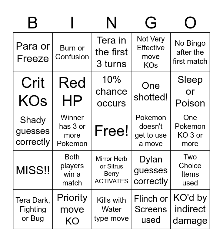 This bingo card has a free space and 24 words: Tera Dark, Fighting or Bug, Both players win a match, 10% chance occurs, Flinch or Screens used, No Bingo after the first match, Para or Freeze, Burn or Confusion, Tera in the first 3 turns, Pokemon doesn't get to use a move, One Pokemon KO 3 or more, Shady guesses correctly, Red HP, Dylan guesses correctly, Two Choice Items used, Crit KOs, Priority move KO, Kills with Water type move, Not Very Effective move KOs, Sleep or Poison, MISS!!, Winner has 3 or more Pokemon, Mirror Herb or Sitrus Berry ACTIVATES, One shotted! and KO'd by indirect damage.