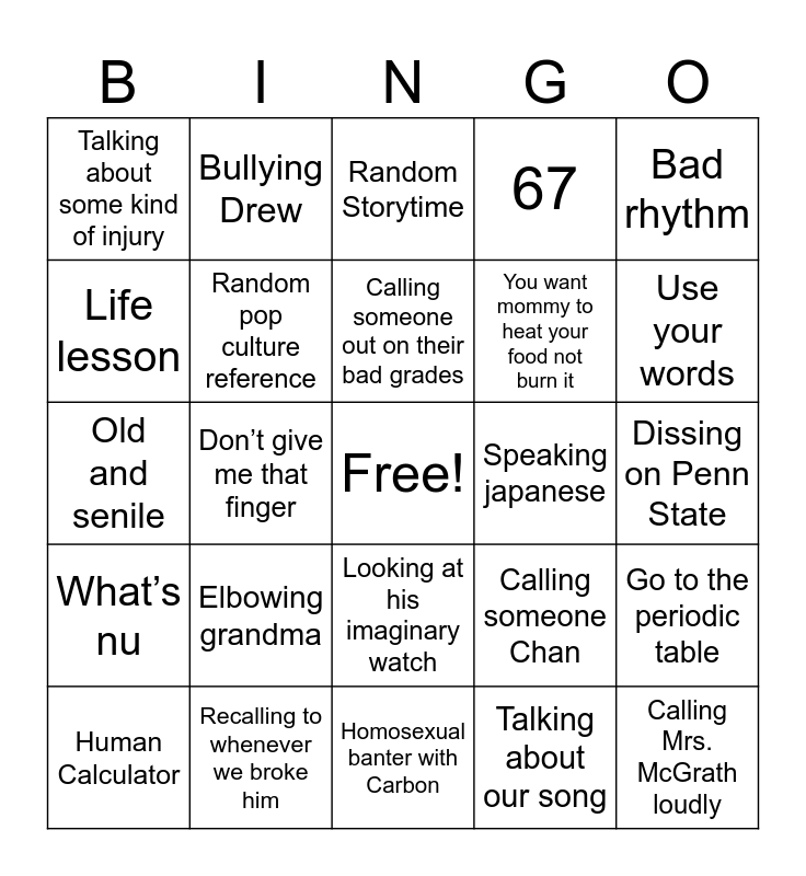 This bingo card has a free space and 24 words: Human Calculator, Elbowing grandma, Calling someone out on their bad grades, Talking about our song, Bad rhythm, Talking about some kind of injury, Bullying Drew, Random Storytime, Speaking japanese, Dissing on Penn State, Old and senile, Random pop culture reference, Calling someone Chan, Go to the periodic table, Life lesson, Recalling to whenever we broke him, Homosexual banter with Carbon, 67, Use your words, What’s nu, Don’t give me that finger, Looking at his imaginary watch, You want mommy to heat your food not burn it and Calling Mrs. McGrath loudly.