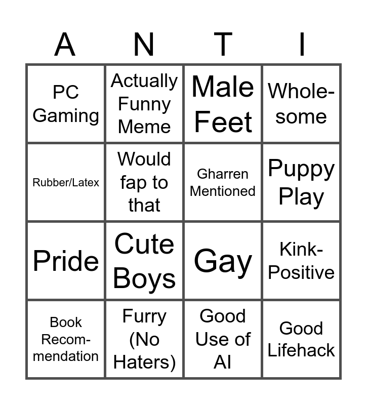 This bingo card has 16 words: Furry (No Haters), Kink-Positive, Male Feet, PC Gaming, Pride, Actually Funny Meme, Gay, Good Use of AI, Rubber/Latex, Would fap to that, Book Recom-mendation, Whole-some, Cute Boys, Puppy Play, Gharren Mentioned and Good Lifehack.