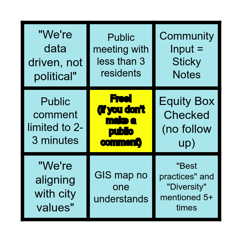 This bingo card has a free space and 8 words: Equity Box Checked (no follow up), Community Input = Sticky Notes, Public meeting with less than 3 residents, "We're aligning with city values", "We're data driven, not political", "Best practices" and "Diversity" mentioned 5+ times, Public comment limited to 2-3 minutes and GIS map no one understands.