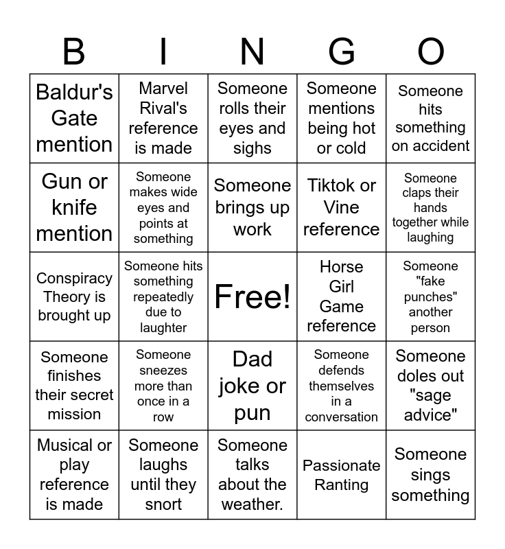 This bingo card has a free space and 24 words: Someone sneezes more than once in a row, Someone laughs until they snort, Someone brings up work, Musical or play reference is made, Someone hits something on accident, Baldur's Gate mention, Gun or knife mention, Marvel Rival's reference is made, Horse Girl Game reference, Dad joke or pun, Tiktok or Vine reference, Conspiracy Theory is brought up, Someone defends themselves in a conversation, Someone doles out "sage advice", Someone makes wide eyes and points at something, Passionate Ranting, Someone "fake punches" another person, Someone rolls their eyes and sighs, Someone claps their hands together while laughing, Someone hits something repeatedly due to laughter, Someone sings something, Someone finishes their secret mission, Someone mentions being hot or cold and Someone talks about the weather..