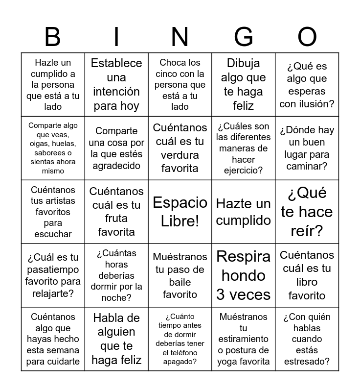 This bingo card has a free space and 24 words: ¿Cuántas horas deberías dormir por la noche?, Habla de alguien que te haga feliz, Cuéntanos cuál es tu verdura favorita, Cuéntanos algo que hayas hecho esta semana para cuidarte, ¿Qué es algo que esperas con ilusión?, Hazle un cumplido a la persona que está a tu lado, Comparte algo que veas, oigas, huelas, saborees o sientas ahora mismo, Establece una intención para hoy, Hazte un cumplido, Muéstranos tu paso de baile favorito, ¿Cuáles son las diferentes maneras de hacer ejercicio?, Cuéntanos tus artistas favoritos para escuchar, Respira hondo 3 veces, Cuéntanos cuál es tu libro favorito, Comparte una cosa por la que estés agradecido, Muéstranos tu estiramiento o postura de yoga favorita, ¿Qué te hace reír?, Choca los cinco con la persona que está a tu lado, ¿Dónde hay un buen lugar para caminar?, Cuéntanos cuál es tu fruta favorita, ¿Con quién hablas cuando estás estresado?, ¿Cuál es tu pasatiempo favorito para relajarte?, Dibuja algo que te haga feliz and ¿Cuánto tiempo antes de dormir deberías tener el teléfono apagado?.