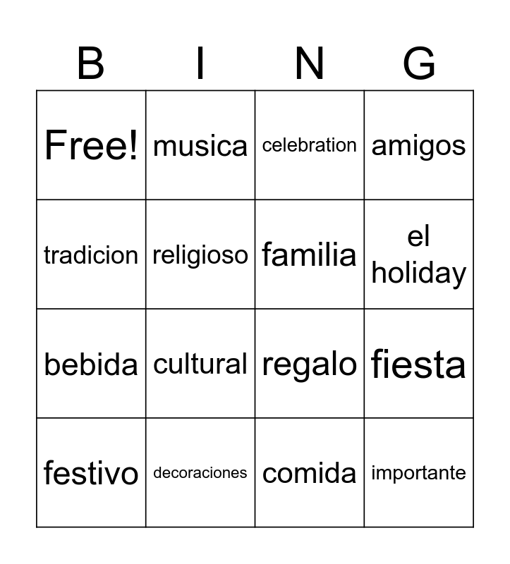 This bingo card has 16 words: festivo, decoraciones, celebration, amigos, tradicion, musica, regalo, fiesta, Free!, religioso, comida, el holiday, bebida, cultural, familia and importante.