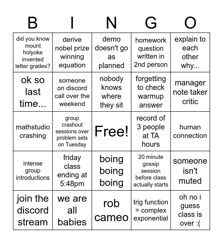 This bingo card has a free space and 24 words: friday class ending at 5:48pm, we are all babies, nobody knows where they sit, join the discord stream, explain to each other why..., did you know mount holyoke invented letter grades?, ok so last time..., derive nobel prize winning equation, record of 3 people at TA hours, boing boing boing, forgetting to check warmup answer, mathstudio crashing, 20 minute gossip session before class actually starts, someone isn't muted, someone on discord call over the weekend, trig function = complex exponential, human connection, demo doesn't go as planned, manager note taker critic, group crashout sessions over problem sets on Tuesday, oh no i guess class is over :(, intense group introductions, homework question written in 2nd person and rob cameo.