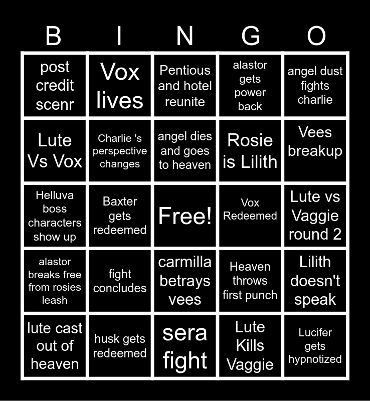 This bingo card has a free space and 24 words: fight concludes, husk gets redeemed, angel dies and goes to heaven, lute cast out of heaven, angel dust fights charlie, post credit scenr, Lute Vs Vox, Vox lives, Vox Redeemed, carmilla betrays vees, Rosie is Lilith, Helluva boss characters show up, Heaven throws first punch, Lilith doesn't speak, Charlie 's perspective changes, Lute Kills Vaggie, Lute vs Vaggie round 2, Pentious and hotel reunite, Vees breakup, Baxter gets redeemed, Lucifer gets hypnotized, alastor breaks free from rosies leash, alastor gets power back and sera fight.