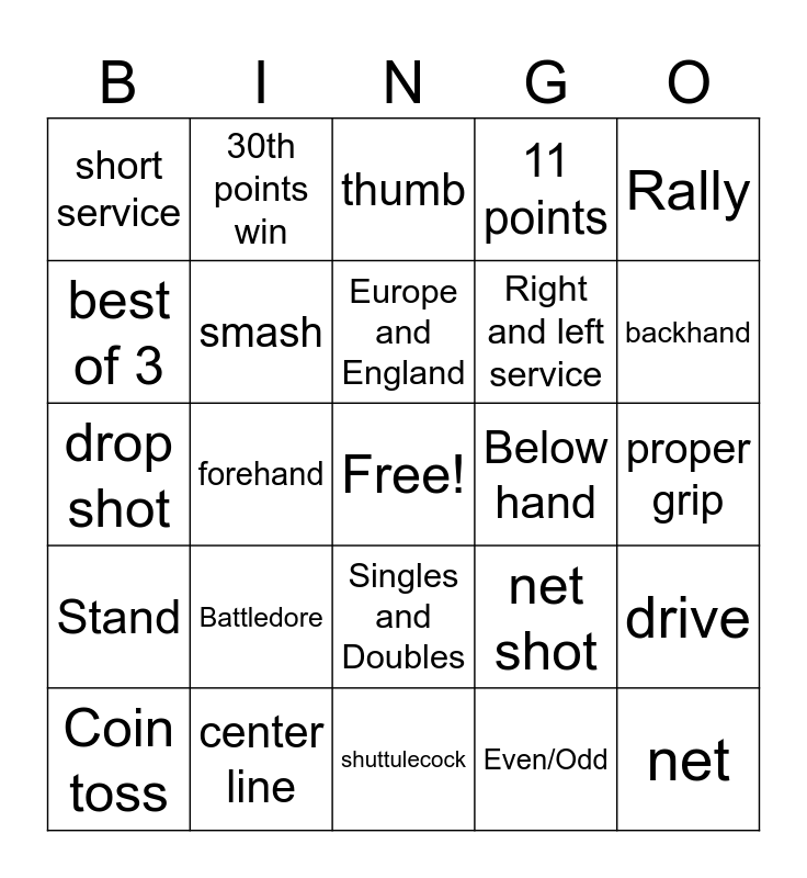 This bingo card has a free space and 25 words: Battledore, shuttulecock, Europe and England, Coin toss, Rally, short service, best of 3, 30th points win, Below hand, Singles and Doubles, Right and left service, drop shot, net shot, drive, smash, clear/lob, proper grip, thumb, backhand, forehand, net, center line, Stand, 11 points and Even/Odd.