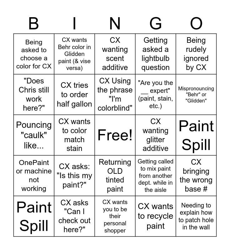 This bingo card has a free space and 24 words: CX asks: "Is this my paint?", CX asks "Can I check out here?", CX Using the phrase "I'm colorblind", Paint Spill, Being rudely ignored by CX, Being asked to choose a color for CX, "Does Chris still work here?", CX wants Behr color in Glidden paint (& vise versa), CX wanting glitter additive, Returning OLD tinted paint, "Are you the __ expert" (paint, stain, etc.), Pouncing "caulk" like..., Getting called to mix paint from another dept. while in the aisle, CX bringing the wrong base #, CX tries to order half gallon, CX wants to recycle paint, Paint Spill, CX wanting scent additive, Mispronouncing "Behr" or "Glidden", CX wants to color match stain, Needing to explain how to patch hole in the wall, OnePaint or machine not working, Getting asked a lightbulb question and CX wants you to be their personal shopper.