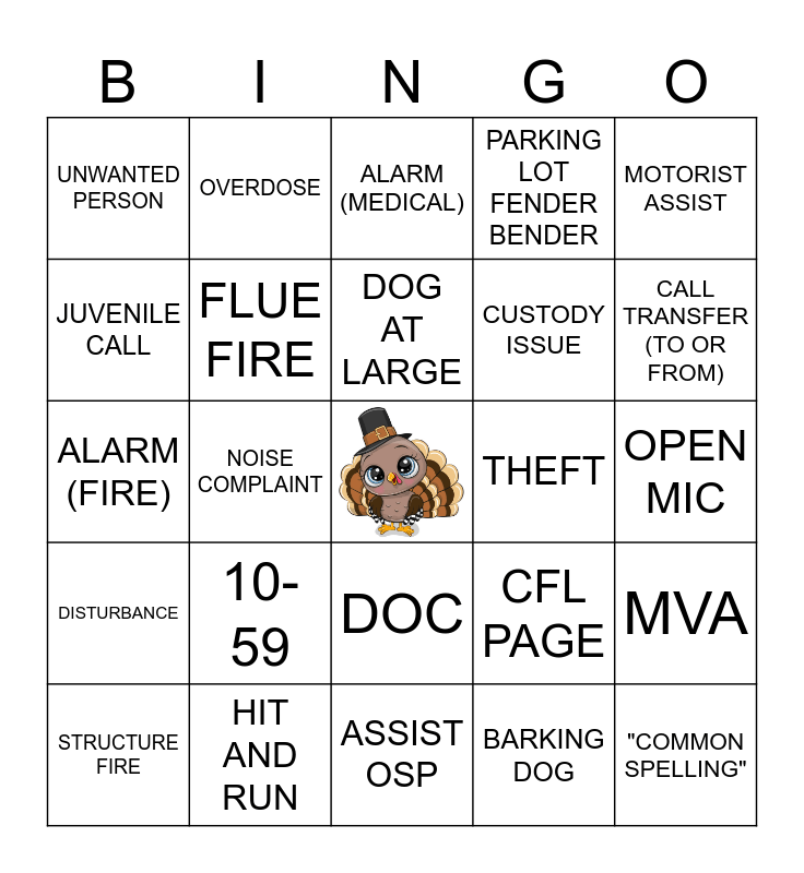 This bingo card has a free space and 47 words: NAWAS (OTHER THAN ROLL CALL), "COMMON SPELLING", DRIVE COMPLAINT, ASSIST OSP, 10-59, SUSPICIOUS PERSON / VEH, OVERDOSE, SUICIDAL, JUVENILE CALL, BREATHING PROBLEM, FLUE FIRE, PARKING LOT FENDER BENDER, MVA, CFL PAGE, WARRANT ARREST, MISDEMEANOR (OR FELONY) DRIVE, DOG AT LARGE, THEFT, CIVIL PROBLEM, MOTORIST ASSIST, NOISE COMPLAINT, BARKING DOG, UNWANTED PERSON, CUSTODY ISSUE, VEH VS DEER, CALL TRANSFER (TO OR FROM), STRUCTURE FIRE, TRESPASS, DOC, DISTURBANCE, ABANDONED VEH, DUII, WELFARE CHECK, 911 HANGUP, PROWLER (VEH OR RESIDENTIAL), HIT AND RUN, OPEN MIC, INTOXICATED PERSON, CHEST PAINS, ANIMAL (OTHER THAN DOG), ALARM (BUSINESS OR RESIDENTIAL), ALARM (MEDICAL), ALARM (FIRE), VEH CRASH, DOMESTIC, LIFT ASSIST and "THIS IS NOT AN EMERGENCY BUT".