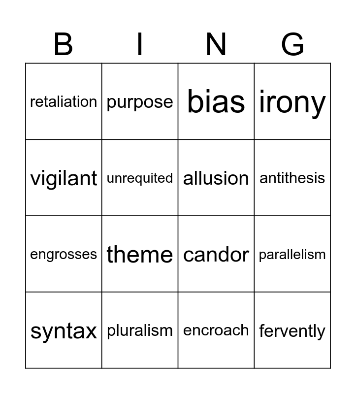 This bingo card has 19 words: candor, usurp, bias, fervently, parallelism, vigilant, encroach, retaliation, purpose, engrosses, theme, unrequited, allusion, pluralism, syntax, exemplify, irony, antithesis and understatement.