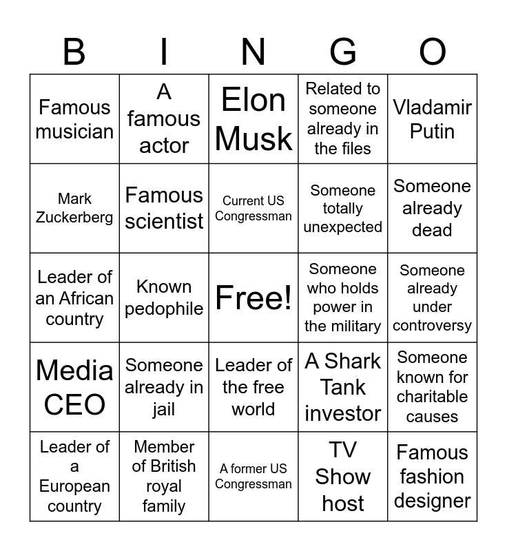 This bingo card has a free space and 24 words: Someone already in jail, Member of British royal family, Current US Congressman, Leader of a European country, Vladamir Putin, Famous musician, Mark Zuckerberg, A famous actor, Someone who holds power in the military, Leader of the free world, Someone totally unexpected, Leader of an African country, A Shark Tank investor, Someone known for charitable causes, Famous scientist, TV Show host, Someone already under controversy, Elon Musk, Someone already dead, Known pedophile, Famous fashion designer, Media CEO, Related to someone already in the files and A former US Congressman.