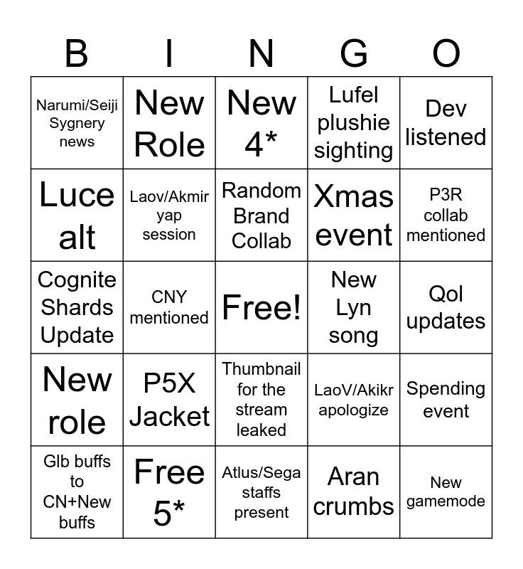 This bingo card has a free space and 24 words: P5X Jacket, Free 5*, Random Brand Collab, Glb buffs to CN+New buffs, Dev listened, Narumi/Seiji Sygnery news, Luce alt, New Role, New Lyn song, Thumbnail for the stream leaked, Xmas event, Cognite Shards Update, LaoV/Akikr apologize, Spending event, Laov/Akmir yap session, Aran crumbs, Qol updates, New 4*, P3R collab mentioned, CNY mentioned, New gamemode, New role, Lufel plushie sighting and Atlus/Sega staffs present.