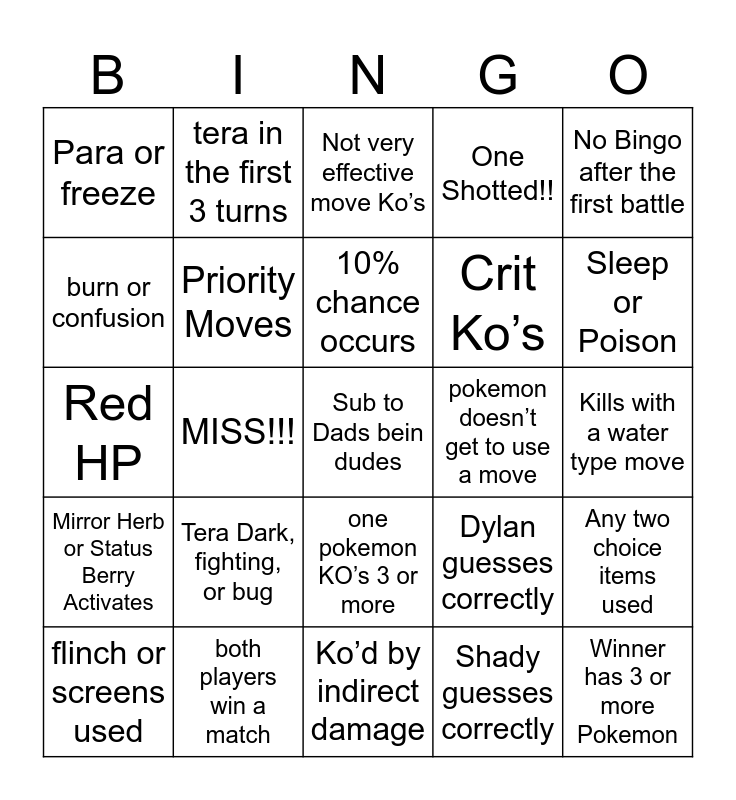 This bingo card has a free space and 24 words: Tera Dark, fighting, or bug, both players win a match, 10% chance occurs, flinch or screens used, No Bingo after the first battle, Para or freeze, burn or confusion, tera in the first 3 turns, pokemon doesn’t get to use a move, one pokemon KO’s 3 or more, Crit Ko’s, Red HP, Dylan guesses correctly, Any two choice items used, Priority Moves, Shady guesses correctly, Kills with a water type move, Not very effective move Ko’s, Sleep or Poison, MISS!!!, Winner has 3 or more Pokemon, Mirror Herb or Status Berry Activates, One Shotted!! and Ko’d by indirect damage.