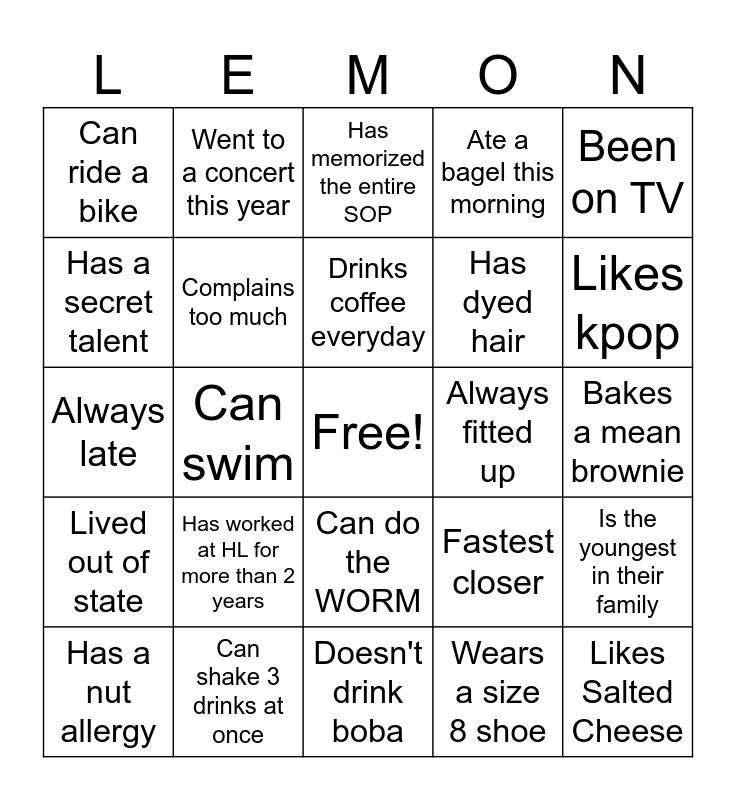 This bingo card has a free space and 63 words: Adopted a pet recently, Has their own apartment, Been to Disney Land this year, Is the youngest in their family, Met a celebrity, Is a Shift Lead, Went to a concert this year, Worked at the company less than a year, Drinks coffee everyday, Not afraid to sing at karaoke, Can do the WORM, Went to the gym before this, Bakes a mean brownie, Been on TV, Is flexible, Has a secret talent, Can swim, Can ride a bike, Speaks more than 1 language, Has dyed hair, Has worked at HL for more than 2 years, Lived out of state, Ate a bagel this morning, Scared another worker, Has drama with another worker, HL is their first job, Has a unique pet name, Been to more than 2 countries, Brought food to this event, Smokes 🍃💨, Favorite color is Purple, Born out of the state, Is older than 21, Has more than 3 pets, Likes kpop, Has a nut allergy, Was in Band in High School, Wears a size 8 shoe, Hates chocolate, Complains too much, Always late, Always fitted up, Has watched the entire Harry Potter, Reads books, Likes Salted Cheese, Can shake 3 drinks at once, Remembers everyones drinks, Fastest closer, Your favorite co worker :), Has a tattoo, Has the best playlist, Doesn't drink boba, Has burned themselves from the waffles, The fastest at making drinks, Has worked a 10 hour shift, Has memorized the entire SOP, Is always cold, Knows all the regulars, Always Opens, Is the "fix-it" person, Always wants extra hours and calls out, Always sick and Has a fun ringtone.