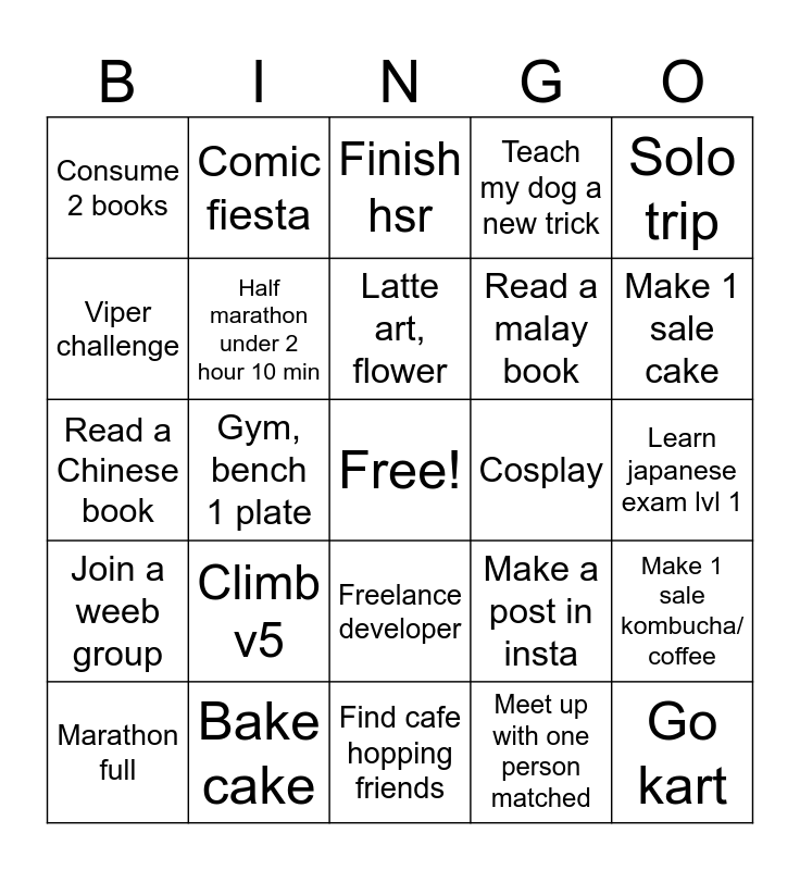 This bingo card has a free space and 24 words: Climb v5, Bake cake, Latte art, flower, Marathon full, Solo trip, Consume 2 books, Viper challenge, Comic fiesta, Cosplay, Freelance developer, Read a malay book, Read a Chinese book, Make a post in insta, Make 1 sale kombucha/ coffee, Half marathon under 2 hour 10 min, Meet up with one person matched, Learn japanese exam lvl 1, Finish hsr, Make 1 sale cake, Gym, bench 1 plate, Go kart, Join a weeb group, Teach my dog a new trick and Find cafe hopping friends.
