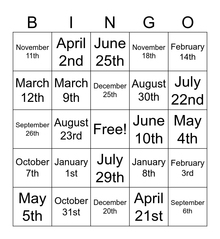 This bingo card has a free space and 24 words: January 1st, October 31st, December 25th, May 5th, February 14th, November 11th, March 12th, April 2nd, June 10th, July 29th, August 30th, September 26th, January 8th, February 3rd, March 9th, April 21st, May 4th, June 25th, July 22nd, August 23rd, September 6th, October 7th, November 18th and December 20th.