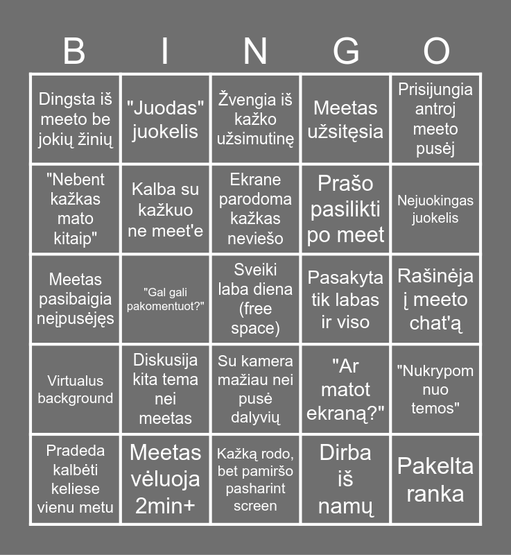 This bingo card has a free space and 44 words: Kalba užsimutinę, Pakelta ranka, Pertraukinėja, Pradeda kalbėti keliese vienu metu, Girdisi kolegos kabinete, Dirba iš namų, Žvengia iš kažko užsimutinę, "Atsiprašau turiu atsijungti", Prisijungia antroj meeto pusėj, Meetas vėluoja 2min+, Meetas užsitęsia, Pasakyta tik labas ir viso, Su kamera mažiau nei pusė dalyvių, Diskusija kita tema nei meetas, "Kas šitą gali padaryt?" Tyla, Kažką rodo, bet pamiršo pasharint screen, Teams stringa, Meetas pasibaigia neįpusėjęs, Tyla 5s, Nejuokingas juokelis, "Juodas" juokelis, Could've been an email, Ginčas, Dingsta iš meeto be jokių žinių, Emoji reakcija, Rašinėja į meeto chat'ą, Techniniai nesklandumai, Nesigirdi meet'o dėl kolegų kabinete, "Ar matot ekraną?", Virtualus background, "Atsiprašau praklausiau", "Nukrypom nuo temos", Ateivinis mikrofonas, Reikia laikino leidimo, "Gal gali pakomentuot?", Accepted, bet nedalyvauja, Tyliai kalba, Serga, bet dirba, Ekrane parodoma kažkas neviešo, "Nebent kažkas mato kitaip", Prašo pasilikti po meet, Rankos sudėtos maldelei, Kalba su kažkuo ne meet'e and Linksi galva.
