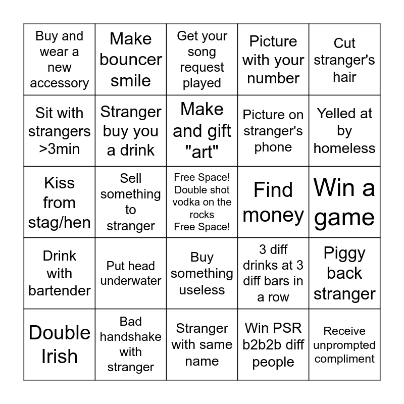 This bingo card has a free space and 33 words: Sing to a crowd, Play a drinking game, Sell something to stranger, Buy stranger a drink, Drink with bartender, Stranger buy you a drink, Cut stranger's hair, Double Irish, Make bouncer smile, Try on strangers clothes, Make and gift "art", Get your song request played, Get a car to honk, Touch a cop, Find money, Yelled at by homeless, Bad handshake with stranger, Kiss from stag/hen, Put head underwater, 3 diff drinks at 3 diff bars in a row, Buy something useless, 2 drinks at 1 bar, Buy and wear a new accessory, Win a game, Stranger with same name, Receive unprompted compliment, Picture with your number, Picture on stranger's phone, Sit with strangers >3min, Piggy back stranger, Happy Birthday sung to you, Win PSR b2b2b diff people and Enter a vehicle.
