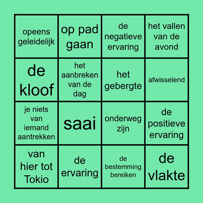 This bingo card has 16 words: de ervaring, de positieve ervaring, de negatieve ervaring, opeens geleidelijk, je niets van iemand aantrekken, op pad gaan, onderweg zijn, de bestemming bereiken, de kloof, het aanbreken van de dag, van hier tot Tokio, het vallen van de avond, saai, afwisselend, het gebergte and de vlakte.