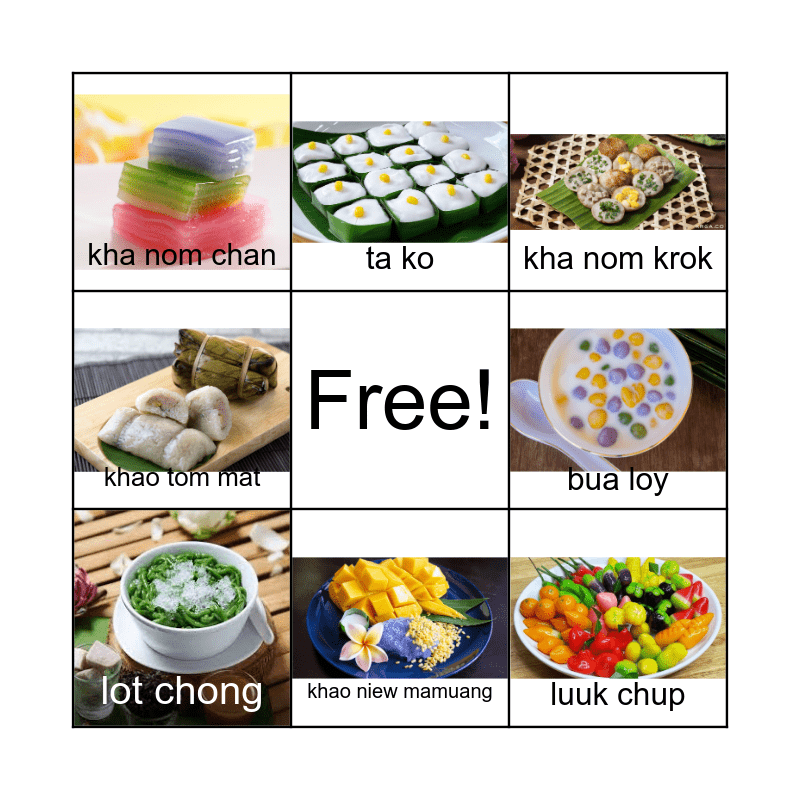 This bingo card has 8 images, a free space and 8 words: bua loy, kha nom krok, ta ko, lot chong, kha nom chan, luuk chup, khao tom mat and khao niew mamuang.