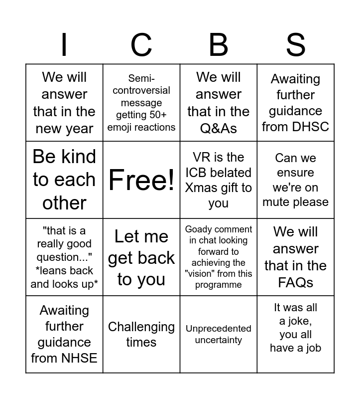 This bingo card has 16 words: Challenging times, We will answer that in the FAQs, We will answer that in the Q&As, We will answer that in the new year, "that is a really good question..." *leans back and looks up*, Semi-controversial message getting 50+ emoji reactions, Goady comment in chat looking forward to achieving the "vision" from this programme, Unprecedented uncertainty, Be kind to each other, Free!, Awaiting further guidance from NHSE, Awaiting further guidance from DHSC, Let me get back to you, Can we ensure we're on mute please, VR is the ICB belated Xmas gift to you and It was all a joke, you all have a job.