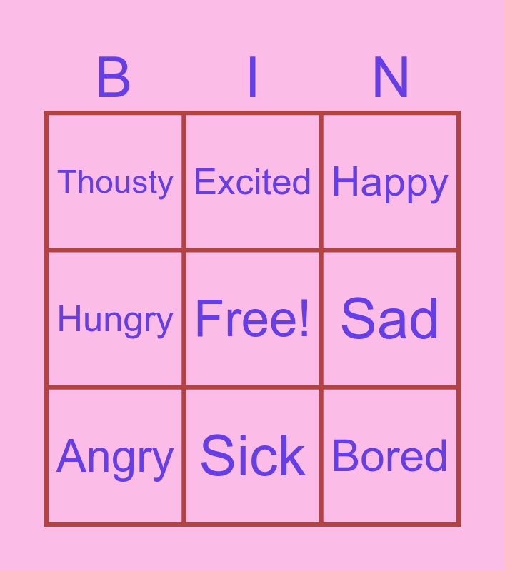 This bingo card has a free space and 8 words: Sad, Happy, Excited, Angry, Thousty, Bored, Hungry and Sick.