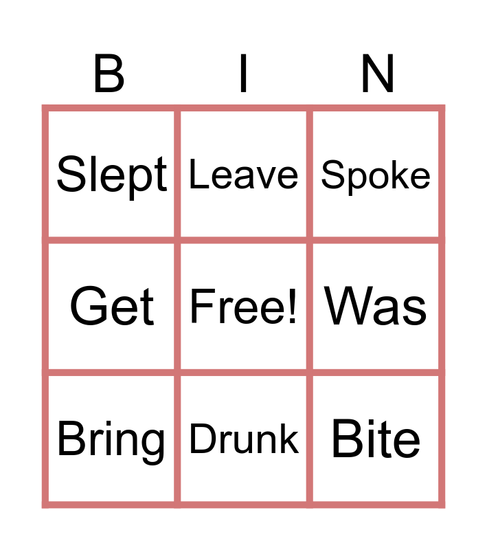 This bingo card has a free space and 17 words: Wear, Went, Spoke, Slept, Were, Get, Break, Bring, Drunk, Was, Make, Say, Bite, Leave, Snap, Buy and Clap.