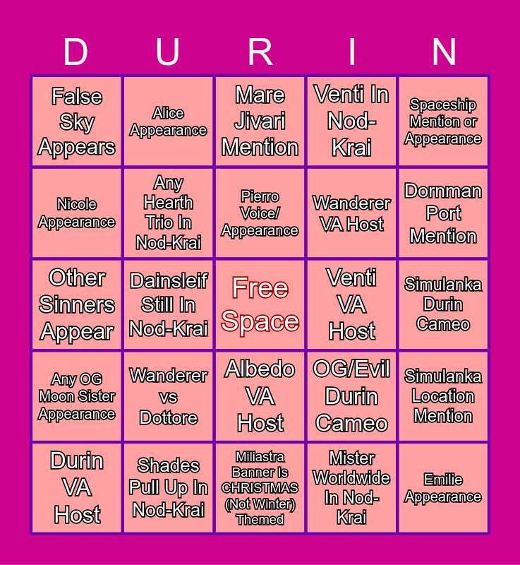 This bingo card has a free space and 24 words: Wanderer vs Dottore, Shades Pull Up In Nod-Krai, Pierro Voice/ Appearance, Durin VA Host, Spaceship Mention or Appearance, False Sky Appears, Nicole Appearance, Alice Appearance, Venti VA Host, Albedo VA Host, Wanderer VA Host, Other Sinners Appear, OG/Evil Durin Cameo, Simulanka Location Mention, Any Hearth Trio In Nod-Krai, Mister Worldwide In Nod-Krai, Simulanka Durin Cameo, Mare Jivari Mention, Dornman Port Mention, Dainsleif Still In Nod-Krai, Emilie Appearance, Any OG Moon Sister Appearance, Venti In Nod-Krai and Miliastra Banner Is CHRISTMAS (Not Winter) Themed.