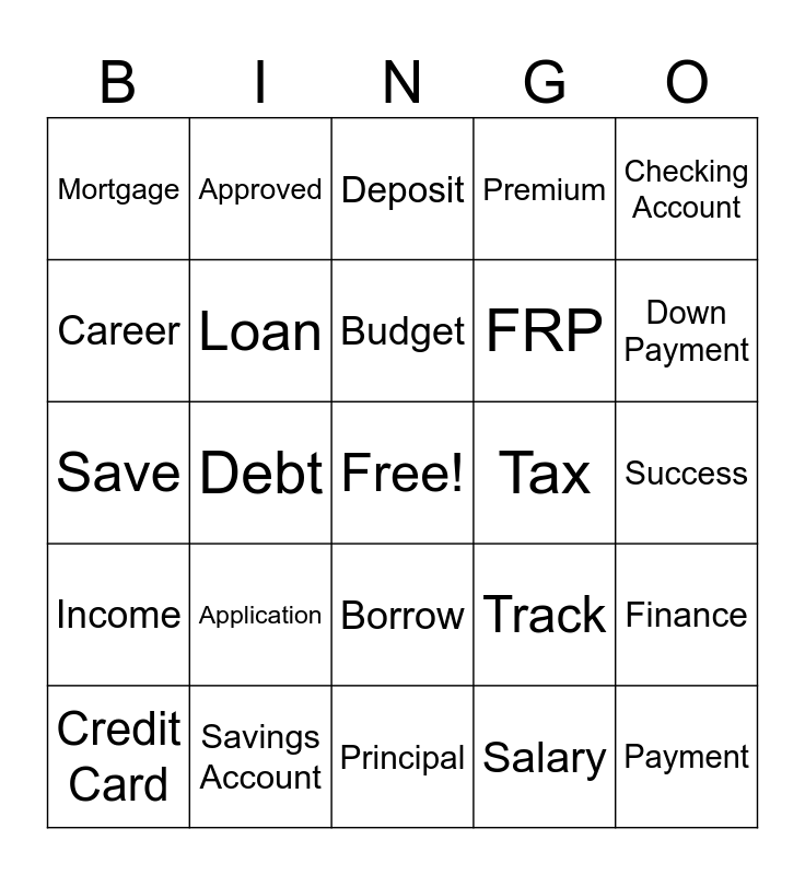This bingo card has a free space and 35 words: Insurance, Class Room, Credit Score, Loan, Borrow, Premium, Career, Earn, Budget, Spend, Save, Checking Account, Money, Interest, Mortgage, Tax, Salary, Debt, Income, Payment, Track, Credit Card, Finance, Savings Account, Deposit, Down Payment, Collections, Dollar, FRP, Success, Expenses, Principal, Application, Approved and Property Taxes.