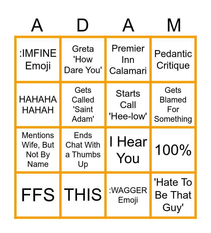 This bingo card has 16 words: THIS, 100%, Premier Inn Calamari, :IMFINE Emoji, Mentions Wife, But Not By Name, Greta 'How Dare You', I Hear You, :WAGGER Emoji, HAHAHA HAHAH, Gets Called 'Saint Adam', FFS, Pedantic Critique, Ends Chat With a Thumbs Up, Gets Blamed For Something, Starts Call 'Hee-low' and 'Hate To Be That Guy'.
