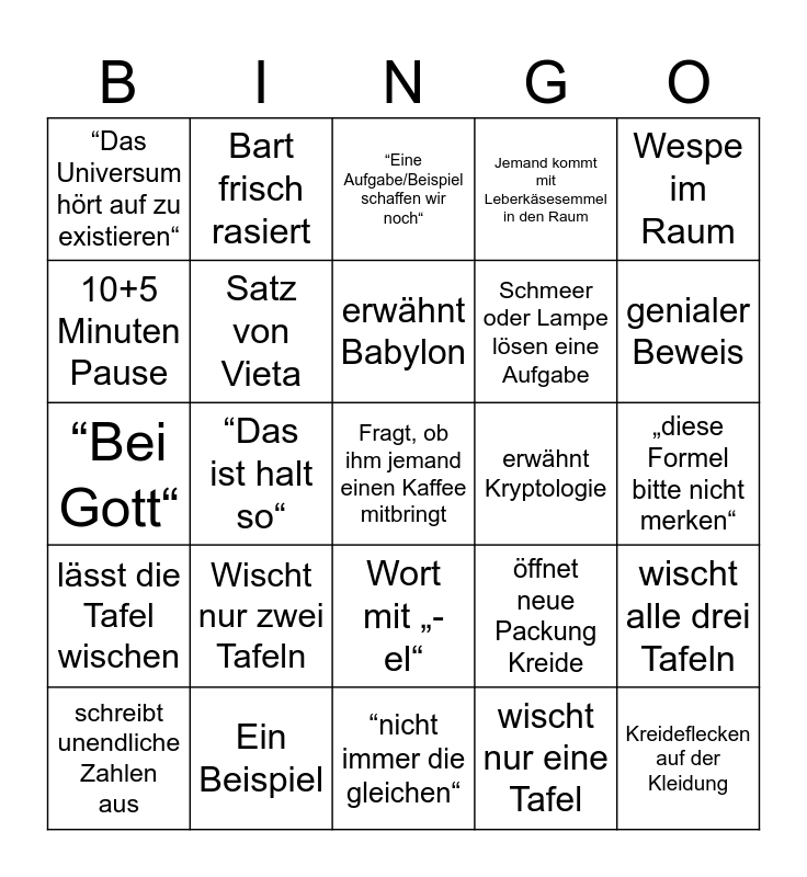 This bingo card has a free space and 24 words: Wischt nur zwei Tafeln, Ein Beispiel, erwähnt Babylon, schreibt unendliche Zahlen aus, Wespe im Raum, “Das Universum hört auf zu existieren“, 10+5 Minuten Pause, Bart frisch rasiert, erwähnt Kryptologie, Wort mit „-el“, Schmeer oder Lampe lösen eine Aufgabe, “Bei Gott“, öffnet neue Packung Kreide, wischt alle drei Tafeln, Satz von Vieta, wischt nur eine Tafel, „diese Formel bitte nicht merken“, “Eine Aufgabe/Beispiel schaffen wir noch“, genialer Beweis, “Das ist halt so“, Kreideflecken auf der Kleidung, lässt die Tafel wischen, Jemand kommt mit Leberkäsesemmel in den Raum and “nicht immer die gleichen“.