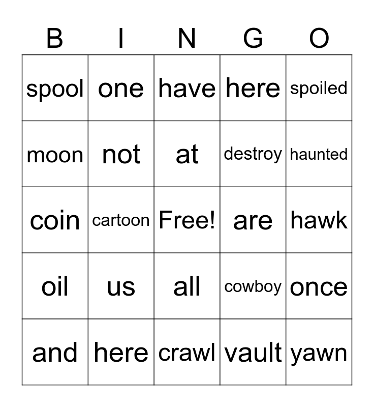 This bingo card has a free space and 29 words: and, from, cartoon, to, spool, have, not, us, are, here, hawk, yawn, crawl, vault, haunted, causes, all, oil, spoiled, coin, cowboy, enjoy, destroy, moon, here, one, once, at and keep.