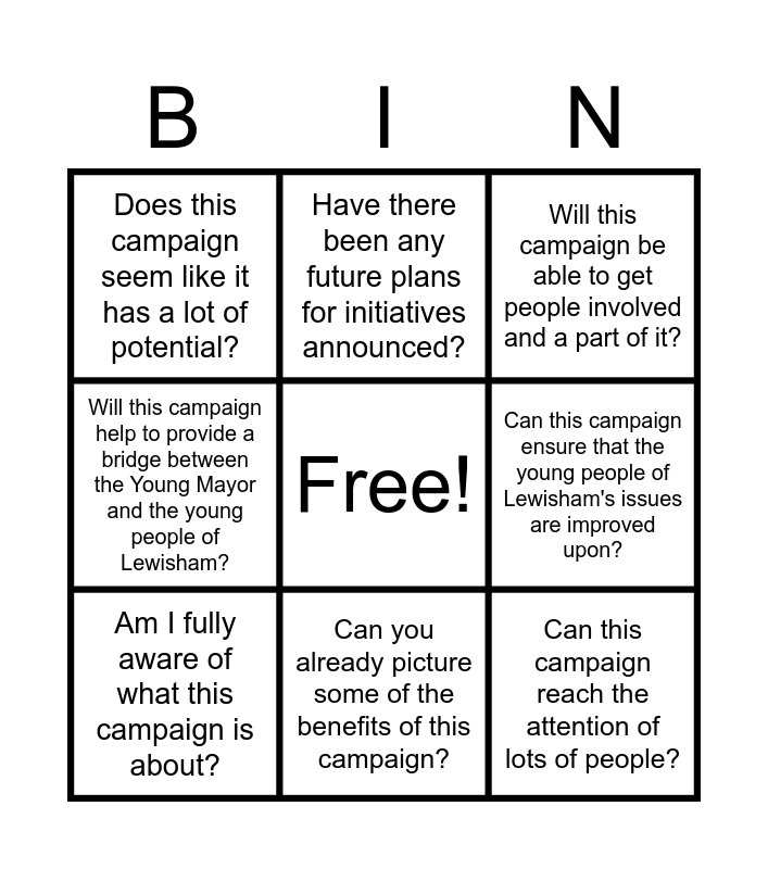This bingo card has a free space and 8 words: Can this campaign ensure that the young people of Lewisham's issues are improved upon?, Will this campaign be able to get people involved and a part of it?, Have there been any future plans for initiatives announced?, Am I fully aware of what this campaign is about?, Does this campaign seem like it has a lot of potential?, Can this campaign reach the attention of lots of people?, Will this campaign help to provide a bridge between the Young Mayor and the young people of Lewisham? and Can you already picture some of the benefits of this campaign?.