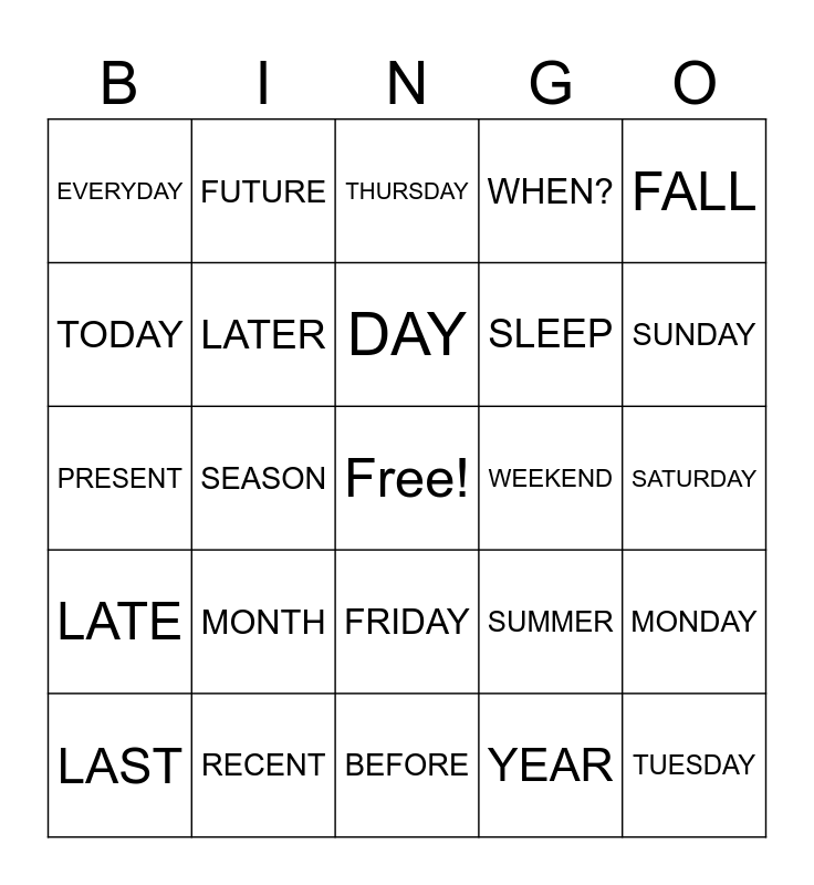 This bingo card has a free space and 42 words: TIME, DAY, WEEK, MONTH, YEAR, MONDAY, TUESDAY, WEDNESDAY, THURSDAY, FRIDAY, SATURDAY, SUNDAY, SEASON, FALL, SPRING, SUMMER, WINTER, PRESENT, PAST, FUTURE, TODAY, TOMORROW, YESTERDAY, EVERYDAY, STOP, PLAN, SLEEP, WAKE-UP, HOUR, MINUTE, EARLY, LATE, LATER, BEFORE, NEXT, LAST, RECENT, WEEKEND, SOON, ALWAYS, WHEN? and WHAT-TIME?.