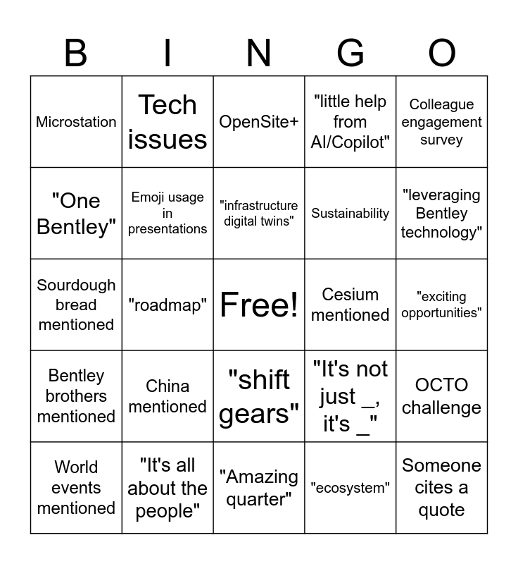 This bingo card has a free space and 27 words: "It's not just _, it's _", Dublin mentioned, Sustainability, "Amazing quarter", "One Bentley", OpenSite+, Tech issues, Bentley brothers mentioned, Cesium mentioned, OCTO challenge, Sourdough bread mentioned, "little help from AI/Copilot", World events mentioned, "It's all about the people", "leveraging Bentley technology", New CPO announced, Emoji usage in presentations, "infrastructure digital twins", China mentioned, Microstation, "exciting opportunities", "ecosystem", "roadmap", Someone cites a quote, "shift gears", Colleague engagement survey and "reflecting back".