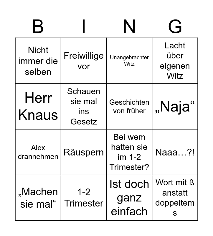 This bingo card has 16 words: 1-2 Trimester, Naaa…?!, Unangebrachter Witz, Nicht immer die selben, Alex drannehmen, Freiwillige vor, Bei wem hatten sie im 1-2 Trimester?, Ist doch ganz einfach, Herr Knaus, Schauen sie mal ins Gesetz, „Machen sie mal“, Lacht über eigenen Witz, Räuspern, „Naja“, Geschichten von früher and Wort mit ß anstatt doppeltem s.