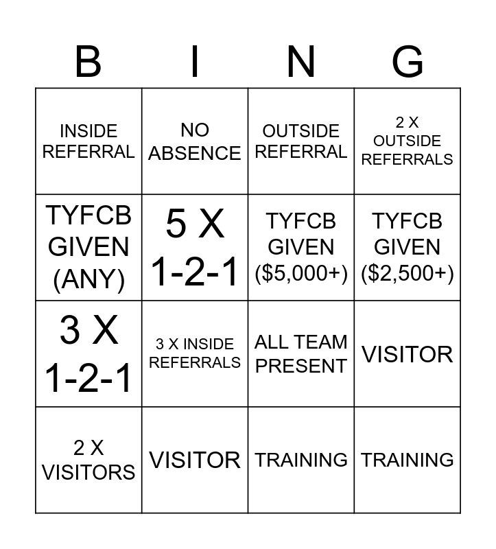 This bingo card has 16 words: VISITOR, VISITOR, OUTSIDE REFERRAL, INSIDE REFERRAL, 3 X 1-2-1, NO ABSENCE, ALL TEAM PRESENT, TRAINING, TYFCB GIVEN (ANY), 5 X 1-2-1, 2 X VISITORS, 2 X OUTSIDE REFERRALS, 3 X INSIDE REFERRALS, TYFCB GIVEN ($2,500+), TYFCB GIVEN ($5,000+) and TRAINING.