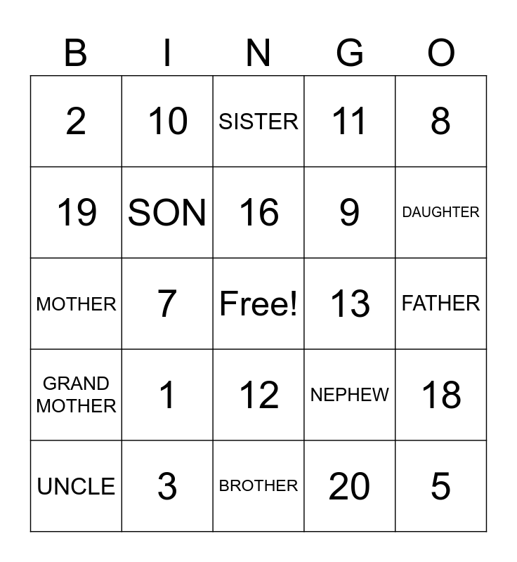 This bingo card has a free space and 34 words: NIECE, 20, AUNT, 14, GRAND MOTHER, SON, 8, UNCLE, 10, COUSIN, 16, SISTER, 6, GRAND FATHER, 13, DAUGHTER, 3, MOTHER, 1, NEPHEW, 12, SIBLING, 2, FATHER, BROTHER, 5, 11, 17, 9, 19, 4, 7, 18 and 15.
