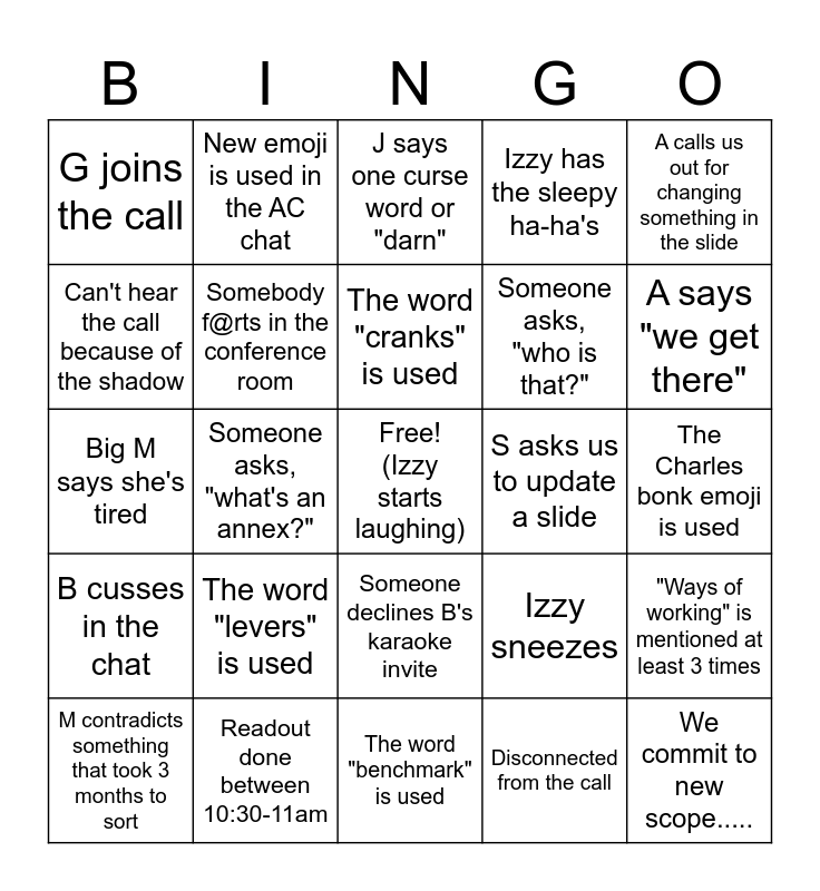 This bingo card has a free space and 24 words: M contradicts something that took 3 months to sort, The word "levers" is used, The word "cranks" is used, Disconnected from the call, A calls us out for changing something in the slide, G joins the call, New emoji is used in the AC chat, J says one curse word or "darn", S asks us to update a slide, The Charles bonk emoji is used, Big M says she's tired, Somebody f@rts in the conference room, Izzy sneezes, "Ways of working" is mentioned at least 3 times, Can't hear the call because of the shadow, Readout done between 10:30-11am, The word "benchmark" is used, Izzy has the sleepy ha-ha's, A says "we get there", B cusses in the chat, Someone asks, "what's an annex?", Someone declines B's karaoke invite, Someone asks, "who is that?" and We commit to new scope......