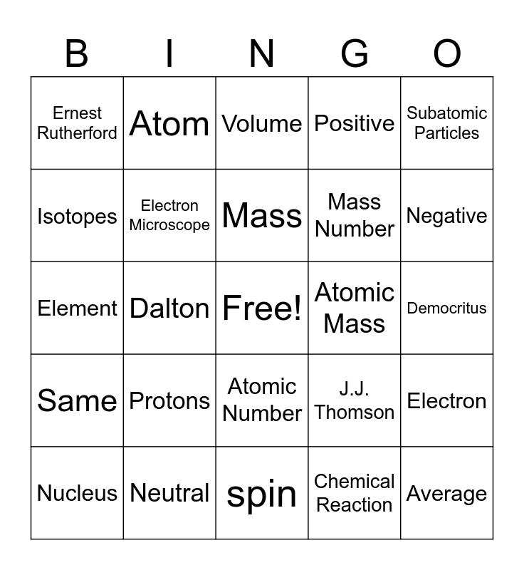 This bingo card has a free space and 24 words: Protons, Neutral, Mass, Nucleus, Subatomic Particles, Ernest Rutherford, Isotopes, Atom, Atomic Mass, Atomic Number, Mass Number, Element, J.J. Thomson, Electron, Electron Microscope, Chemical Reaction, Democritus, Volume, Negative, Dalton, Average, Same, Positive and spin.