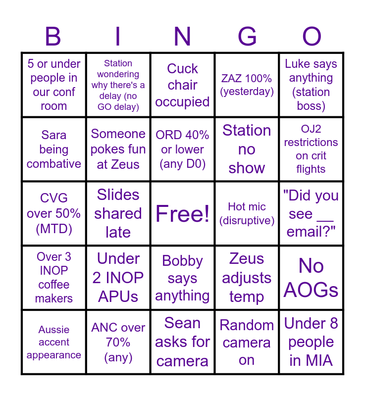 This bingo card has a free space and 31 words: Sean asks for camera, Sean brings laptop, Slides shared late, Manny sits in a different spot, 5 or under people in our conf room, Cuck chair occupied, Someone pokes fun at Zeus, Zeus adjusts temp, Hot mic (disruptive), Random camera on, "Did you see __ email?", Under 8 people in MIA, ULD input, Safety input, OJ2 restrictions on crit flights, Charter brief under 2m35s, No AOGs, Under 2 INOP APUs, Over 3 INOP coffee makers, Bobby says anything, Luke says anything (station boss), Nolan excuse, Aussie accent appearance, Station wondering why there's a delay (no GO delay), Station no show, Sara being combative, ZAZ 100% (yesterday), CVG over 50% (MTD), ANC over 70% (any), ORD 40% or lower (any D0) and 2 or more missed opportunities.