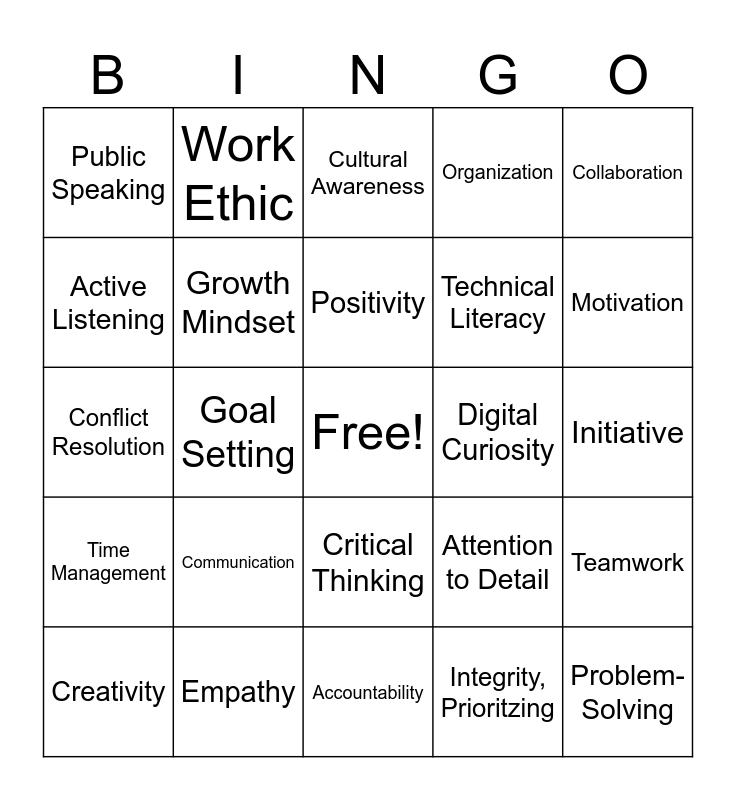 This bingo card has a free space and 31 words: Accountability, Decision Making, Goal Setting, Stress Management, Public Speaking, Cultural Awareness, Growth Mindset, Attention to Detail, Digital Curiosity, Integrity, Prioritzing, Initiative, Problem-Solving, Patience, Dependability, Motivation, Reponsibility, Teamwork, Communication, Time Management, Critical Thinking, Collaboration, Leadership, Creativity, Work Ethic, Technical Literacy, Active Listening, Organization, Conflict Resolution, Empathy, Positivity and Feedback.