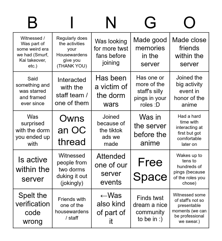 This bingo card has 25 words: Witnessed people from two dorms duking it out (jokingly), ←Was also kind of part of it, Has been a victim of the dorm wars, Spelt the verification code wrong, Made close friends within the server, Witnessed / Was part of some weird era we had (Smurf, Kai takeover, etc.), Said something and was starred and framed ever since, Regularly does the activities your Housewardens give you (THANK YOU), Was in the server before the anime, Attended one of our server events, Has one or more of the staff's silly pings in your roles :D, Was surprised with the dorm you ended up with, Free Space, Wakes up to tens to hundreds of pings (because of the roles you chose), Interacted with the staff team / one of them, Witnessed some of staff's not so presentable moments (we can be professional we swear.), Had a hard time with interacting at first but got comfortable later on, Was looking for more twst fans before joining, Joined the big activity event in honor of the anime, Owns an OC thread, Joined because of the tiktok ads we made, Friends with one of the housewardens / staff, Is active within the server, Made good memories in the server and Finds twst dream a nice community to be in :).
