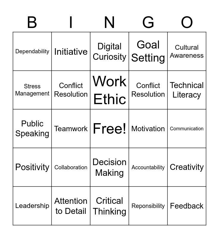 This bingo card has a free space and 35 words: Integrity, Prioritzing, Organization, Conflict Resolution, Decision Making, Goal Setting, Stress Management, Communication, Work Ethic, Empathy, Public Speaking, Cultural Awareness, Growth Mindset, Patience, Dependability, Motivation, Reponsibility, Teamwork, Positivity, Feedback, Accountability, Leadership, Creativity, Attention to Detail, Digital Curiosity, Technical Literacy, Active Listening, Organization, Conflict Resolution, Communication, Time Management, Critical Thinking, Collaboration, Initiative and Problem-Solving.