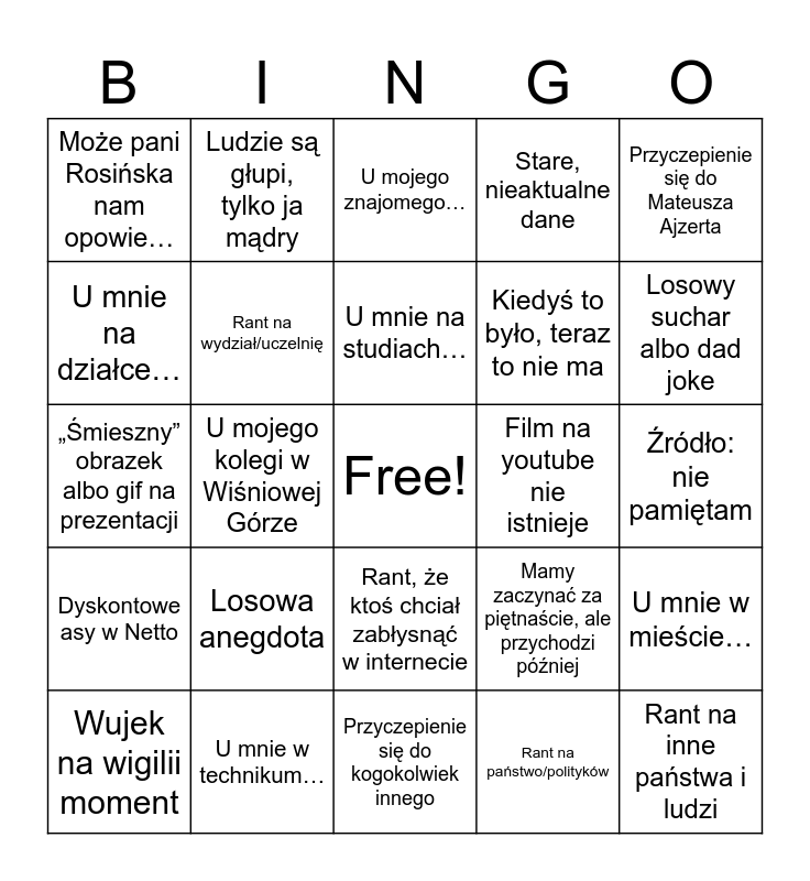 This bingo card has a free space and 24 words: Losowa anegdota, U mnie w technikum…, U mnie na studiach…, Wujek na wigilii moment, Przyczepienie się do Mateusza Ajzerta, Może pani Rosińska nam opowie…, U mnie na działce…, Ludzie są głupi, tylko ja mądry, Film na youtube nie istnieje, Rant, że ktoś chciał zabłysnąć w internecie, Kiedyś to było, teraz to nie ma, „Śmieszny” obrazek albo gif na prezentacji, Mamy zaczynać za piętnaście, ale przychodzi później, U mnie w mieście…, Rant na wydział/uczelnię, Rant na państwo/polityków, Źródło: nie pamiętam, U mojego znajomego…, Losowy suchar albo dad joke, U mojego kolegi w Wiśniowej Górze, Rant na inne państwa i ludzi, Dyskontowe asy w Netto, Stare, nieaktualne dane and Przyczepienie się do kogokolwiek innego.