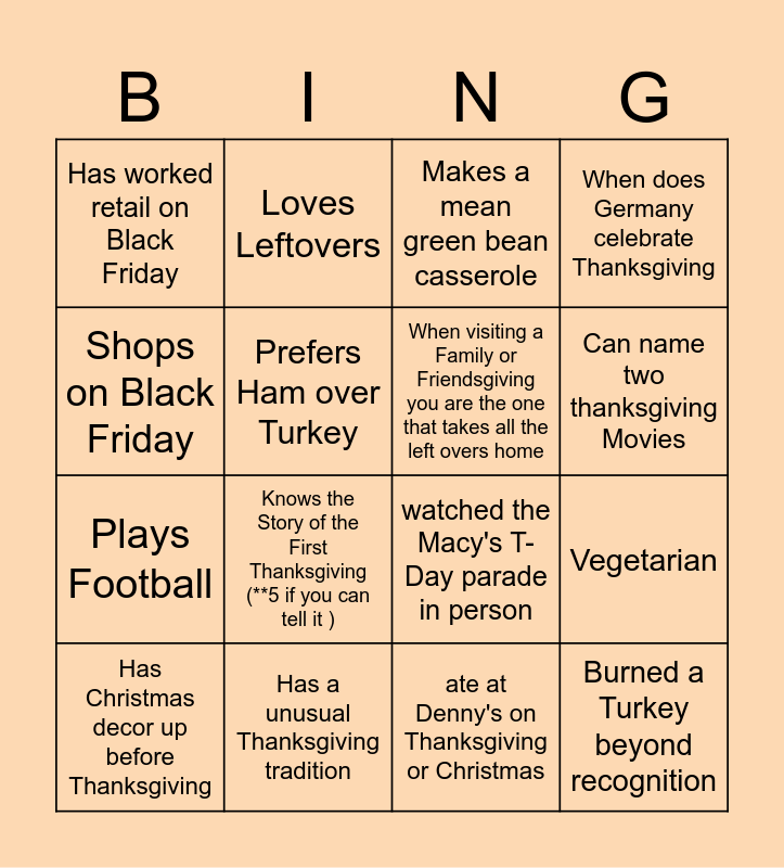 This bingo card has 16 words: Has a unusual Thanksgiving tradition, Vegetarian, Makes a mean green bean casserole, Has worked retail on Black Friday, Plays Football, Loves Leftovers, watched the Macy's T-Day parade in person, ate at Denny's on Thanksgiving or Christmas, Shops on Black Friday, Prefers Ham over Turkey, Has Christmas decor up before Thanksgiving, When does Germany celebrate Thanksgiving, Knows the Story of the First Thanksgiving (**5 if you can tell it ), Can name two thanksgiving Movies, When visiting a Family or Friendsgiving you are the one that takes all the left overs home and Burned a Turkey beyond recognition.